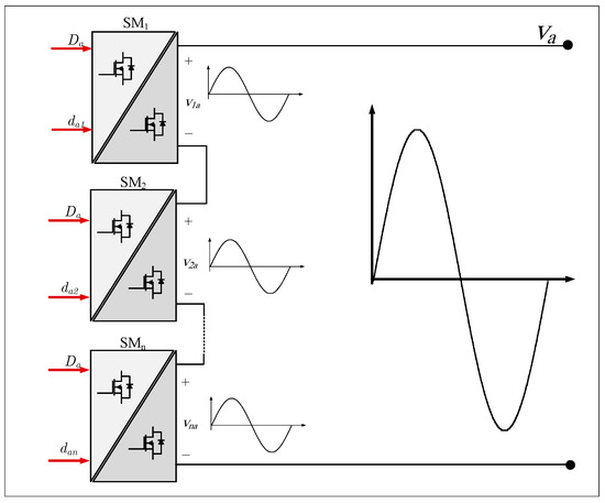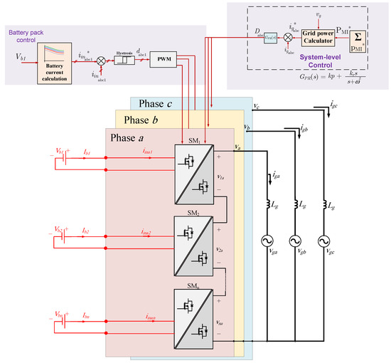 It should be noted that the active power P will be positive when the CMC is delivering power to the grid and negative if the grid is charging the batteries connected in parallel with the SMs. In the normal operation, the SM number k in phase j generates the voltage of: