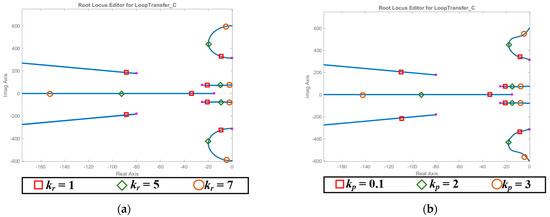 Pole-zero maps of the PR controller of Mode 3: (a) kp = 0.5 and kr = [1:7], and (b) kr = 5 and kp = [0.1:3].