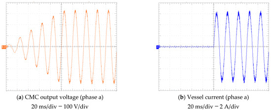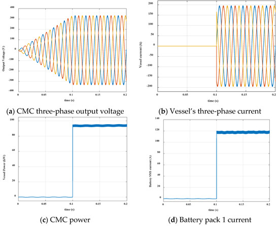 Figure 23 shows the SM-level control when the CMC is operating as a three-phase inverter and the power flows from the battery packs to the vessel. The batteries’ discharging current is controlled so the output voltage tracks the reference one. The output voltage is generated and increases gradually until t = 0.1 s. Then, the vessel’s contactor is turned. Figure 23a shows the output voltages. Figure 23b shows the vessel’s current. The power transferred to the vessel is shown in Figure 23c. Figure 23d shows the discharging current of the battery pack connected to the first SM.