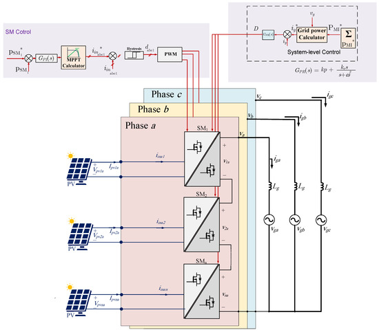 In this mode, the CMC is still operating as a three-phase inverter and the SMs are working as single-phase dc/ac current source inverter. The power is transferred directly from the PV modules to the ac grid. Figure 24 shows the full system with the sub-panel and system-level controllers. The MPPT algorithm itself is not in the scope of this paper and, therefore, it will be assumed that the reference power values for each sub-panel are already known and calculated. The reference current of the kth SM is controlled by the duty–cycle ratios dk. These ratios for different SMs will not be identical if the PV arrays have different operational points for any mismatch, such as partial shading, for example. These individual SM controllers will operate the system properly if all SMs are at identical operational points. However, a system-level controller is necessary in the case of mismatch to balance the output voltages and current of the different SMs. The system-level controller at the top right will generate a central duty–cycle ratio D for all SMs, which will be added to the individual dk duty–cycle ratios.