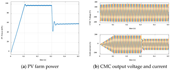 Figure 25 shows the MATLAB/SIMULINK simulation results for a case study when the power of the PV modules is increased gradually from 0 at t = 0 s to 100% at t = 0.1 s. To simulate the transient response, the PV modules’ powers are reduced to 60% at t = 0.3 s. Figure 25a shows the total power of the PV farm. Figure 25b shows the CMC output power with the grid current. Figure 25c shows the input current of the first PV array, which is connected to SM1. Figure 25d shows the PV curves with the associated operational points.