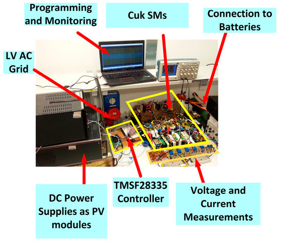 An experimental prototype is built to test the operation of the proposed CMC, as shown in Figure 26. The three-phase CMC has 12 SMs (4 SMs per phase) each rated at 250W and, hence, the full system is rated at 3 kW. The system is controlled by a TMS32028335 DSP with the parameters in Table 5. The DC voltage sources have been used to mimic the PV modules in the associated modes of operation.
