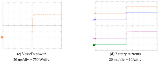 The vessel’s load is simulated to be a passive load of Rves = 52 Ω to produce the rated power at the vessel’s full voltage. In this experiment, the output voltage is generated by the Cuk-based SMs and is controlled to increase gradually until t = 0.1 s. Then, the vessel’s contactor is turned. Figure 28a shows the output voltages. Figure 28b shows the vessel’s current. The power transferred to the vessel is shown in Figure 28c. Figure 28d shows the discharging current of the battery pack connected to the first SM.