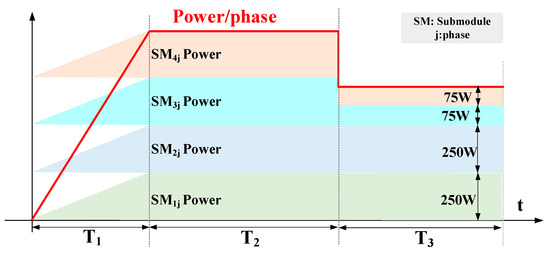 Figure 29 shows the power command of each phase to show this capability. During the period T1, the CMC has equal power sharing between the SMs in each phase when they start from zero power and increase gradually. During T2, the SMs reach the maximum power of 250W. The period T3 simulates the partial shading when the top two SMs keep generating 250W, while the other two drop to 30%, making the total power decrease to 65%.