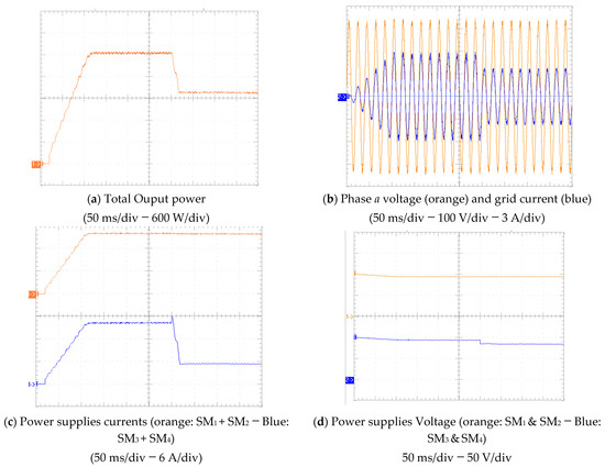 Figure 30 shows the corresponding experimental results for this case. Two power supplies are used. The first two SMs are connected to one power supply, and they will be considered as unshaded modules, while the other two SMs will be connected to another power supply as shaded modules starting from t = 0.3 s. Figure 30a shows the total power of the system. From t = 0 s to 0.1 s, the power increases gradually until it reaches the maximum total value of 3 kW. Then, the total power drops at t = 0.3 s to 65% because two SMs are considered shaded. Figure 30b shows phase a voltage and current. Figure 30c shows the currents of the two power supplies. Figure 30d shows the two power supplies’ voltages.
