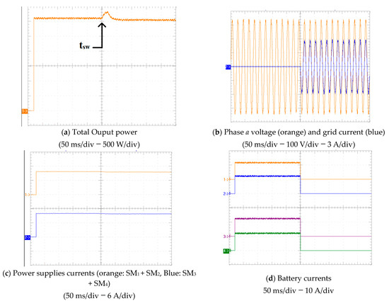 In this experiment, the modular inverter was operating originally in Mode 2.2, where the power flows from the power supplies, which are mimicking the PV modules to the batteries. When the batteries’ voltages reached the maximum limit, the operation switched to Mode 2.4, where the power has been directed to the grid using the associated switch, as explained in Table 1. In Figure 31, the system switches from Mode 2.2 to 2.4 at t = 250 ms. Figure 31a shows the total power of the system, where the control system directed the power from the power supplies to the grid. Figure 31b shows the grid voltage and output current of phase a. The output current started to flow into the grid once Mode 2.4 has been activated. The power supplies’ currents are shown in Figure 31c, where they are kept constant during the two modes. Figure 31d shows the battery segments’ currents when they have stopped charging the batteries at tsw.