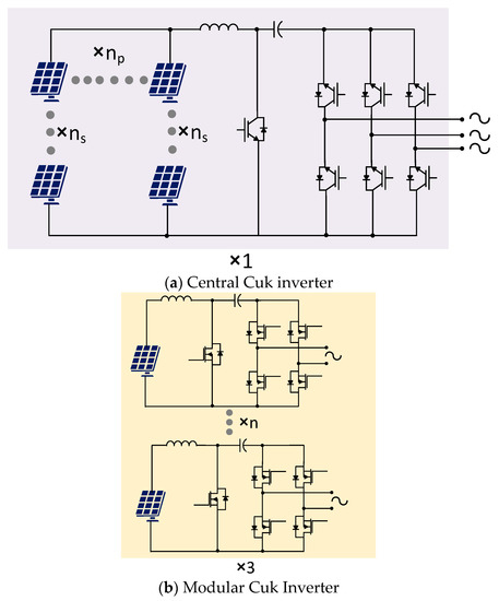 As shown in Figure 32a, the PV modules will be connected in a series parallel combination to form one array. The number of parallel strings is np, while the number of series modules in the string is ns. Thus, the current rating of the input switch is np × Impp. The current rating of the output switches is Isw = P/√3Vg. All the switches should be rated at voltage of Vg+ nsVmpp. For the modular structure in Figure 32b, the PV array connected to the Cuk inverter has reduced ns and np and, hence, the voltage and current stresses will be reduced, allowing for using smaller devices with lower on resistances and faster on/off switching times.