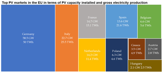 In recent years, there has been a dynamic growth of the photovoltaic market in the EU. One of the most important reasons for this trend is the significant development of photovoltaic technologies, which results in decreased prices. Generally, it can be stated that this form of obtaining electricity has become price-competitive compared to traditional energy sources [5]. An important aspect is the system of subsidies, which has been enforced in various forms in some countries, including many European ones. In 2021, the total installed capacity in PV was almost 158 GW, which is 18.7% of the total installed capacity in PV globally. Compared to the previous year, this is an increase of approximately 16%. Figure 1 shows the top 10 markets for PV technology in the EU. The data characterizing individual markets include the installed capacity in PV in GW and the amount of electricity produced from PV in TWh for 2021 [16,17,18].