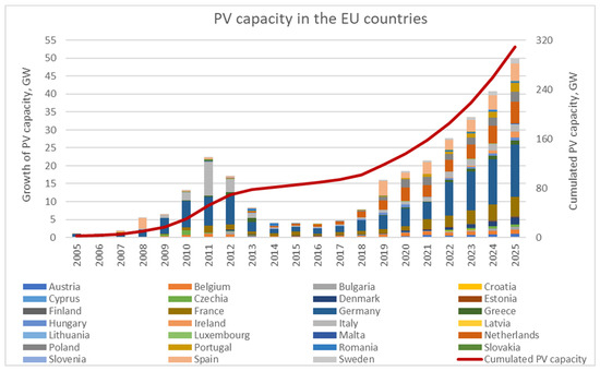 Figure 4 shows the installed capacity in the years 2005–2025 in individual EU countries in the context of the value of the annual increase. These data are compared with the cumulative installed PV capacity for EU-27 countries.
