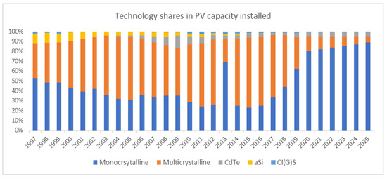 Estimates of the share of individual PV technologies are based on the analysis of the Frauenhofer Institute [26], which provided the shares of individual PV technologies in previous years. The data cover the years 1997–2021. Based on the forecast contained in [5], it was determined that the share of 2nd-generation technology in the years 2022–2025 will amount to approximately 5%, and amorphous modules (aSi) will not be practically used. In the case of 1st-generation technology, an increase in monocrystalline modules is assumed at the expense of polycrystalline ones. This is due to the development of monocrystalline technology, which, achieving higher efficiencies, becomes price-competitive with polycrystalline technology. The list of shares of individual PV technologies is shown in Figure 5.