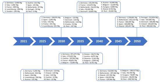 Figure 6 summarizes the mass fluxes of PV waste generated for selected years, including the countries with the highest flux values. In each of the considered cases, Germany generates the largest flux of waste annually. The next places of the summary vary for every year. Countries with high installed PV capacities, in addition to Germany, are Italy, France, Spain and the Netherlands. However, the ranking of these countries in terms of PV waste generation over the 2021–2050 period is not same. For example, in 2021, 2025 and 2030, Luxembourg ranked high in the summary of the amount of annual EoL growth of PV panels. This is a country with a relatively early start in investing in PV, hence ranking among the top countries in the early years of the projected waste PV panel market. Subsequent analyzed years did not show significant streams of PV waste generation compared to other EU countries; therefore, Luxembourg was no longer in the lead. In addition, the country’s small surface area, which translates into a smaller area for PV investments, resulted in an inability to compete with larger-area countries, which intensified their PV investments in subsequent years. An example of such a country is Poland, which has significantly increased its level of installed PV capacity, starting from 2017. The installed PV capacity was increased by 157 and 58% in 2019/2020 and 2020/21, respectively. This is one of the examples of countries with a significant increase in photovoltaic investments in a short period of time. One of the reasons is the electricity billing system, which is advantageous for the prosumers, as well as the possibility of obtaining subsidies [45]. A similar situation took place in Hungary and Denmark, as well as in the Czech Republic and Belgium. However, in the case of the last two countries mentioned, the growth took place a bit earlier, starting in 2008. A fully predicted case is Ireland, which is expected to significantly increase the amount of installed PV capacity in 2022–2025. The forecast showed that significant amounts of PV waste will be generated in Ireland in 2050.