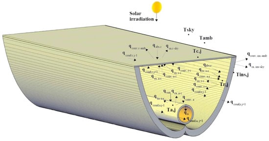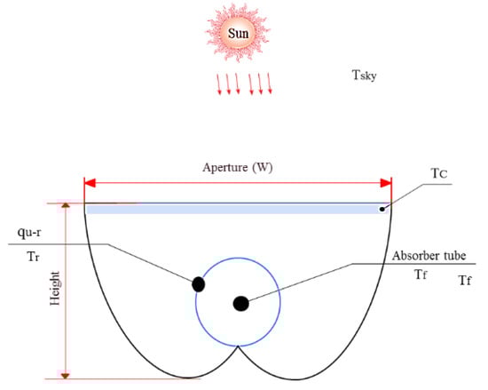 Since CPC solar collectors are exposed to environmental conditions, CPC solar collectors are affected by environmental conditions, and energy is transferred from the collector to the environment. The absorbed solar energy is transferred to the absorber tube and from the absorber tube to the working fluid, which increases the temperature of the working fluid in the absorber tube and the fluid leaving the solar collector [53]. The following hypotheses are considered to analyze the thermal behavior of the CPC solar collector: