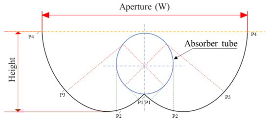 To calculate and design parabolic solar collectors, a Cartesian plane is used in which the two main parts of the geometry are drawn in a curve and a parabola based on the dimensions of the absorber tube [45,46]. For restricting the shape of CPC solar collectors in relation to angle, Baum (1984) proposed equations measured by rotating the absorber tube around its center point counterclockwise from the positive x-axis [47]. These equations can be used to calculate the geometry of CPC solar collectors in the coordinate plane, as well as their curves for parts in the plane and parabolas.