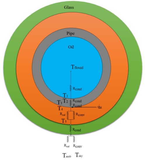 In this paper, a cpc collector is a tube for the solar energy absorber. Beer et al. (2014) conducted a study to analyze a coaxial lobe. They obtained the total heat loss coefficient using the thermal resistance analysis of a pipe. This is exactly the analogy presented by Hsieh (1981) [4]. This resistor consists of the sum of the convection heat transfer layer of the tube wall resistor and the two sides of the tube inner wall. The coefficient of fluid convection in the inner and outer part of the tube is analyzed using the Gnielinski correlation. For the pipes, the diameter is equal to D = 2r [72].