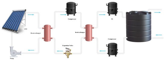 Figure 9 shows the installation diagram of the CPC solar collector and high-temperature heat pump and the piping equipment and CPC solar collector temperature control instrument that comply with the standard [ASHRAE 2014] [77].