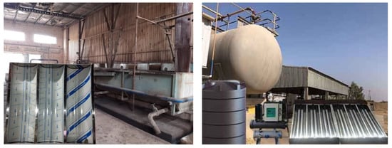 The CPC collector, which is installed as a hot water production system in a pipe manufacturing company, is shown in Figure 9. Installing CPC solar collectors in series or in parallel with the working fluid flow allows them to perform fluid circulation operations when the valves are opened or closed and to increase heat transfer. Additionally, to produce more hot fluid, several solar CPC collectors with specific capacities can be connected in series or in parallel.