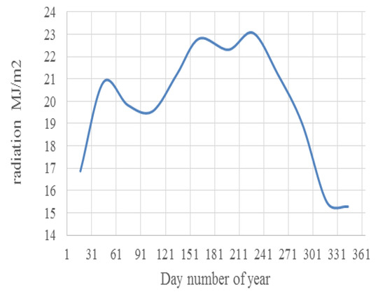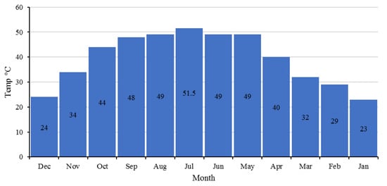 Due to the fact that Ahvaz is located in a hot and humid region and the temperature is warm in most months of the year, the high amount of air temperature and the temperature difference play important roles on the efficiency and power of the solar collectors. Solar collectors have different capacities on air temperature [58,78,79]. Table 2 shows the minimum and maximum air temperature of Ahvaz city. Figure 10 shows the daily changes in air temperature and Figure 11 shows the monthly changes.