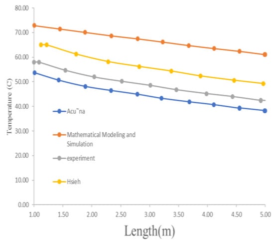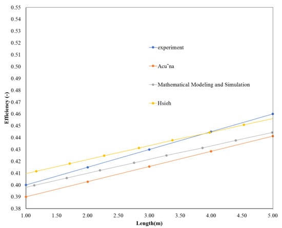 Figure 14 shows the effects of the absorber length and efficiency of CPC solar collector and the outlet temperature of the working fluid. According to the comparison and analysis of the results, the presented mathematical model is a logical result and in the experimental range of other researchers. Figure 15, Figure 16 and Figure 17 show the characterization results of a CPC solar collector operating at a flow rate. The simulation results of the CPC solar collector in MATLAB and Aspen HYSYS software were evaluated and compared with the experimental results and the results of other researchers.