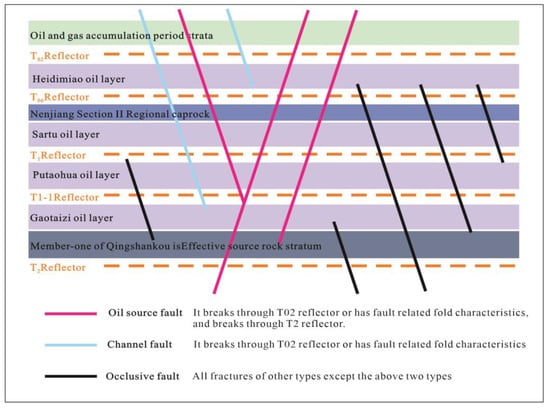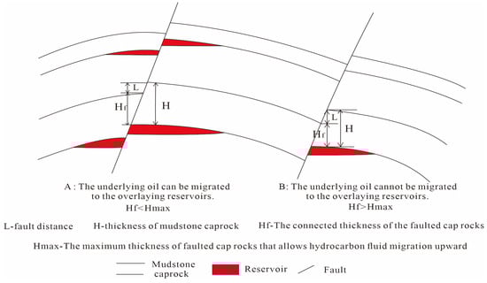 Hydrocarbon fluid exploration practice reports that the hydrocarbon fluid that has accumulated or has been accumulating under mudstone cap rocks will be adjusted and will migrate to the overlying strata when faults destroy the overlying mudstone cap rocks. This will not only reduce hydrocarbon fluid accumulation numbers, but will also complicate the vertical hydrocarbon fluid distribution, which will bring difficulties to hydrocarbon fluid exploration activities [,,,,,,,,,]. Understanding this problem is critical for the hydrocarbon fluid exploration of faulted blocks in petroliferous basins. Previous studies have investigated hydrocarbon fluid migration from the underlying strata to the overlying strata. Besides the genetic relationships between reservoirs in vertical as well as reservoir development controllers [,,,,,,,], research mainly focuses on whether hydrocarbon fluid can migrate through faults [,,,,,,], e.g., faults destroying the continuity of mudstone cap rocks [,,] and fractures destroying the sealing ability of mudstone cap rocks [,,,]. However, these investigations are mainly performed at a certain point or in a certain hydrocarbon fluid reservoir, lacking prediction of the zone where underlying hydrocarbon fluid migrated to the overlying reservoirs, which is undoubtedly not conducive to the exploration activities at these kinds of reservoirs. Therefore, it is of great significance to establish a prediction method for hydrocarbon fluid migration through faulted cap rocks to guide hydrocarbon fluid exploration.
