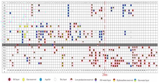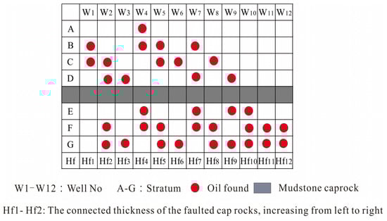 The above analysis suggests that the actual connected thickness being less than the maximum value required is responsible for hydrocarbon fluid’s upward migration. Therefore, it is necessary to determine the connected thickness at the mudstone cap rocks and the maximum connected thickness required. The connected thickness at the mudstone cap rocks can be determined by the cap rocks’ thickness and the fault displacement acquired from drilling and seismic data. The required maximum connected thickness cannot be inferred theoretically and can only be determined via indirect methods under current research and technology. Specifically, the first is to obtain the mudstone thickness and fault throw at known well points, calculate connected thickness, arrange them in an increasing order, and then, identify the hydrocarbon fluid distribution above and below the corresponding mudstone cap rocks (Figure 2). The connected thickness at mudstone cap rocks (Hf9–Hf10 in Figure 2) where hydrocarbon fluid is distributed both at the upper and lower parts of the mudstone cap rocks is taken as the maximum connected thickness required for hydrocarbon fluid migration through the mudstone cap rocks. If the connected thickness is higher than the required maximum value, the underlying hydrocarbon fluid can only be accumulated and distributed under mudstone cap rocks, rather than migrating through them. On the contrary, the underlying hydrocarbon fluid can migrate through the mudstone cap rocks when the connected thickness is smaller than the required maximum value, where hydrocarbon fluid can be accumulated and distributed both under and above the mudstone cap rocks (Figure 2). Finally, all the calculated connected thicknesses should be marked on faults to map their plane distribution. After that, the area where the measured connected thickness is smaller than the required maximum value should be mapped to predict hydrocarbon fluid migration through the faulted cap rocks.