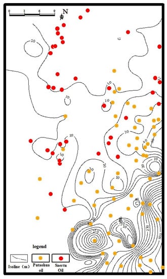 The connected thickness was determined via Sapu mudstone thickness and related fault throws, which were arranged from small-scale to large-scale. After that, hydrocarbon fluid distribution above and below the Sapu mudstone was determined, and is described in Figure 7, which exhibits that a maximum connected thickness of 20 m was required for Putaohua hydrocarbon fluid migration to the overlying Saertu reservoir in the Bayan Chagan Area. After that, the Sapu mudstone thickness and fault throw in the Bayan Chagan Area were calculated to determine the connected thickness, and they were marked and mapped to exhibit its lateral variation (Figure 8). Finally, the hydrocarbon fluid migration from the Putaohua reservoir to the overlying Saertu reservoir was obtained and found to have the maximum connected thickness (red in Figure 8). Figure 8 shows that all hydrocarbon fluid discovered from the Saertu reservoir in the Bayan Chagan Area is at the top of the adjusted Putaohua reservoir, while no hydrocarbon fluid was discovered at the Saertu reservoir and where no adjustment occurred at the Putaohua reservoir. However, this could have occurred where the connected thickness was greater than the maximum value required for upward hydrocarbon fluid migration. Drilling and seismic data also reveal that the regional mudstone caprock at the second member of the Nenjiang Formation was developed above the Saertu reservoir. Figure 9 shows that it is widely distributed in the Bayan Chagan Area, especially at the southeast, with the maximum thickness is >500 m. The thickness gradually decreases from the southeast to its surrounding areas and is less than 100 m in a small part of the west.