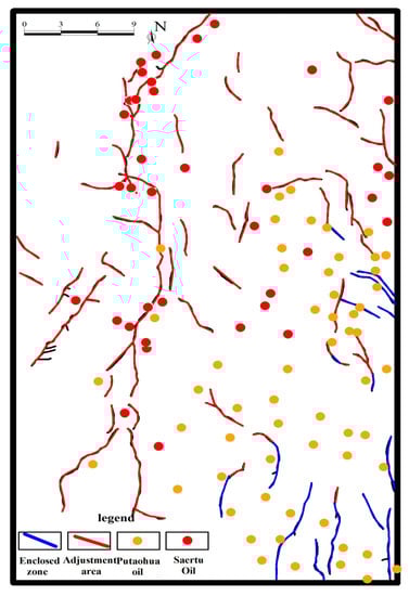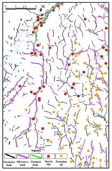 Previous studies have investigated hydrocarbon fluid migration from the underlying strata to the overlying strata. Besides the genetic relationships between reservoirs in vertical as well as reservoir development controllers [,,,,,,,], research mainly focuses on whether hydrocarbon fluid can migrate through faults [,,,,,,], e.g., faults destroying the continuity of mudstone cap rocks [,,] and fractures destroying the sealing ability of mudstone cap rocks [,,,,,,,,,]. However, these investigations are mainly performed at certain points or in a certain hydrocarbon fluid reservoir, lacking prediction of the zone where underlying hydrocarbon fluid migrated to the overlying reservoirs, which is undoubtedly not conducive to the exploration activities at these kinds of reservoirs. Therefore, it is of great significance to establish a prediction method for hydrocarbon fluid migration through faulted cap rocks to guide hydrocarbon fluid exploration.