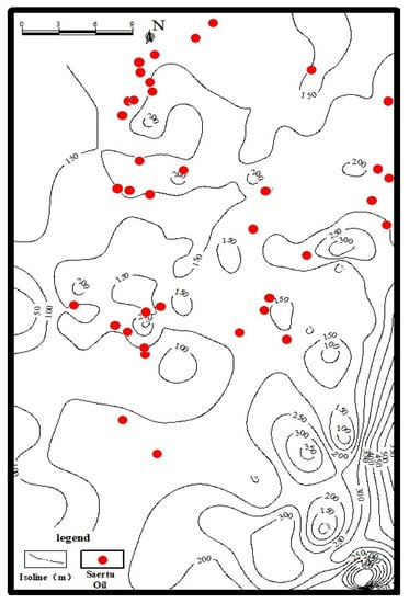Drilling and seismic data suggest that Sapu mudstone is developed at the top of the Putaohua reservoir in the Bayan Chagan Area. Figure 4 shows that the Sapu mudstone is widely distributed in the Bayan Chagan Area, with a maximum thickness >500 m at the southeast of the study area. It gradually decreases in the surrounding areas, with the minimum value (less than 10 m) in the central, western, and northern areas.