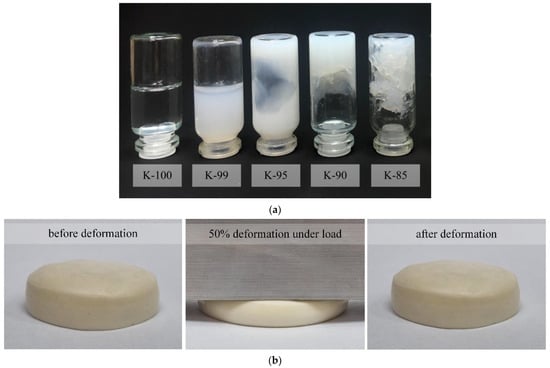 Appearance of gel fuels: (a) Liquid and plastically deformable fuel compositions based on kerosene: K-100—100 % kerosene, K-99—99 wt% kerosene, 1 wt% silicon dioxide, K-95—95 wt% kerosene, 5 wt% silicon dioxide, K-90—90 wt% kerosene, 10 wt% silicon dioxide, K-85—85 wt% kerosene, 15 wt% silicon dioxide; (b) Elastically deformable: 50 vol% oil + 48 vol% aqueous solution of PVA (10 wt%) + 2 vol% emulsifier.