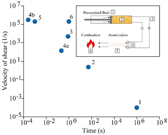 Shear rate and characteristic time of the stages implementation of the typical gel fuel life cycle [45,112,113,114,115]: 1—storage; 2—moving from the fuel tank to the transport channel; 3—moving in fuel line; 4—atomization with nozzle (4a) or hydraulic nozzle (4b); 5—movement of fuel fragments (particles or droplets) in the combustion chamber; 6—melting, evaporation and combustion of fuel.