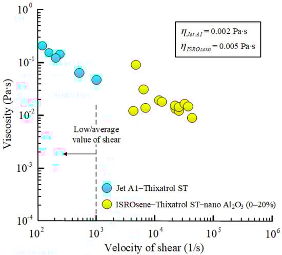 The results [69,70] (Figure 3) illustrate that with increasing shear rate, the viscosity of xylene gel (Jet A1 jet fuel, Thixatrol ST organic thickener) decreases, and the viscosity of gel propellant (ISROsene kerosene, Thixatrol ST organic thickener, xylene) is quasi-constant. The spread of values according to the data (kerosene ISROsene, organic thickener Thixatrol ST, xylene) is due to different concentrations of 0–20% alumina particles in the fuel composition [69,70].