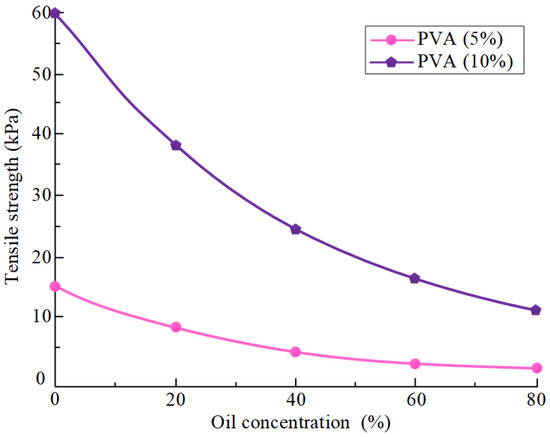 The dependence of the tensile strength of oil-filled cryogels fuel pellets on the oil concentration at different concentrations of PVA aqueous solutions [109].