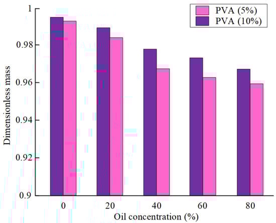 The influence of elastic deformation along the axis of symmetry at the application of 6.5 kPa on the loss of moisture (oil) was established [109] for the same compositions. The authors found that the lower the density of the polymer matrix in the gel fuel, the greater the mass loss of the sample after deformation (Figure 5). The moisture loss of compositions based on a 10% PVA solution is on average 1% less than that of compositions with a 5% PVA solution. At higher oil concentrations, the density of the polymer matrix is lower. During deformation of oil-filled cryogels with an oil concentration of 80%, the loss of moisture due to deformation is 2–2.5 times greater than for cryogels containing 20% oil.