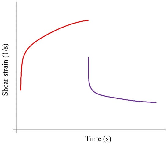 When conducting experimental studies on the creep of gel fuel, the shear stress is controlled (set) and the shear rate is changed in steps or in a continuous mode [138]. As a result, information is obtained not only about the viscoelastic properties of the gel fuel, but also about the creep yield strength of the gel fuel at a long-term constant shear stress [50]. The type of typical dependences obtained in the study of the creep of gel fuel [138] is shown in Figure 6.