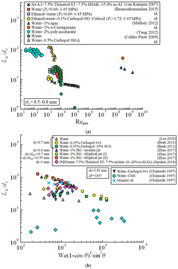 - Zhao, F.; Qin, L.Z.; Fu, Q.F.; Mo, C.J.; Yang, L.J. Spray Characteristics of Elliptical Power-Law Fluid-Impinging Jets. J. Fluids Eng. Trans. ASME 2017, 139, 40. [Google Scholar] [CrossRef]