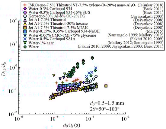 - Baek, G.; Kim, S.; Han, J.; Kim, C. Atomization Characteristics of Impinging Jets of Gel Material Containing Nanoparticles. J. Non-Newton. Fluid Mech. 2011, 166, 1272–1285. [Google Scholar] [CrossRef]