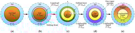 A typical process of burning gel fuel (Figure 2) in practice consists of six main stages [45,112,113,114,115], which successively replace each other: (1) storage; (2) moving from the fuel tank to the transport channel; (3) movement along the fuel pipeline (mainly through pipelines); (4) atomization (or dispersion); (5) movement of fuel fragments (particles or drops) in the combustion chamber; (6) melting, evaporation and combustion of fuel. Storage is the longest period during which the gel fuel causes the least intake due to gravity.