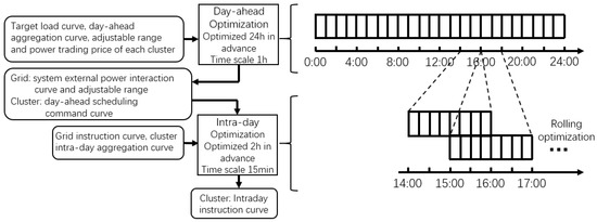 Treating clusters and regional loads involving optimization as a system, a two-stage cluster optimization strategy including day-ahead optimization and intra-day rolling optimization is developed to realize the full utilization of cluster resources and ensure the executability of optimized instructions. The multi-timescale optimization architecture is shown in Figure 2.