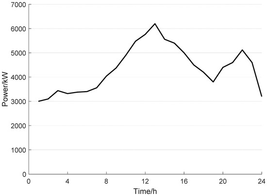 The system contains three clusters, numbered as cluster 1, cluster 2, and cluster 3, whose day-ahead aggregation curves and adjustable margin ranges are shown in Figure 4 and the target curves issued by the grid to the system are shown in Figure 5. Cluster 1 is mainly composed of distributed photovoltaic but also includes a small amount of distributed wind turbines, distributed energy storage and load. Cluster 2 is mainly composed of distributed wind turbines but also includes a small amount of distributed energy storage and load. Cluster 3 is a load zone with the distributed wind turbines, distributed photovoltaic and distributed energy storage used to achieve the self-supply of energy to a certain. To simplify the calculation, it is assumed that each cluster has a fixed daily power trading price with the grid, As shown in Table 1. Set the iteration termination condition of the potential game to .