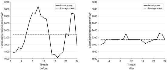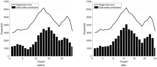 In order to verify the efficiency of the method in the paper, the results before and after optimization are compared and analyzed. The fitting effect of the total power output of the clusters to the target curve for each time period before and after optimization is shown in Figure 6, and the system external power interaction curve (the difference between the target load curve and the total power output of the clusters) is shown in Figure 7. After optimization, the day-ahead instructions to each cluster are shown in Figure 8, and the power transaction cost of the grid through the clusters is shown in Table 2.
