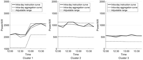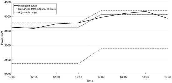 Based on the parameters and results of day-ahead optimization, the scenarios and parameters of intra-day optimization are set. To reflect the typicality, the 2 h period from 12:00–2:00 is taken as an example for the simulation analysis of intraday optimization arithmetic. The instruction curve of the grid to the system is shown in Figure 9, and the instruction curve should not exceed the adjustable margin of the system. The intra-day aggregated power curve of each cluster in this 2 h period is shown in Figure 10.