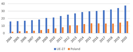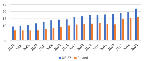 The overarching purpose of European climate policy is to achieve a climate-neutral economy by 2050. The sectors that must be particularly transformed include energy, transport, and agriculture. The energy sector is a priority due to its high emissivity, which accounts for over 75% of direct and indirect greenhouse gas emissions in the EU. The European Green Deal (EGD) clearly points to the energy that is based on energy efficiency and renewable sources, at the same time strongly departing from coal and reducing the emissions of the gas sector. The energy transition requires a significant investment effort, especially in the countries that are mostly dependent on fossil fuels. As part of The Just Transition Mechanism (JTM), the European Commission predicts a large financial support from the European Union in order to achieve climate neutrality (Poland is to receive EUR 3.5 billion from the Just Transition Fund (JTF)) [5,6]. One of the important activities aimed at the energy transformation of the economies of the European Union Member States is to provide targeted support to accelerate and promote the development of the renewable energy market, including agricultural biogas. When analyzing the data on the share of renewable energy in the energy generated in Poland and the EU-27 (27 countries of the European Union, excluding the UK) for the years 2004–2020, an increase in their importance is observed. The share of renewable energy in Poland is much lower than the EU-27 average (Figure 1). An even greater difference is in the share of renewable energy in gross electricity consumption (Figure 2). This indicates the possibilities and the need to increase energy production from renewable sources in Poland.
