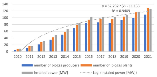 As of 31 December 2021, there were 128 biogas plants owned by 109 economic entities in Poland. The total installed electric power of these biogas plants amounted to 125,323 MW of electricity in 2021. The first biogas plant in Poland was launched in 2004. When analyzing the development of biogas plants in Poland since 2010 (Figure 3), their dynamic growth can be noticed. At the same time, in recent years, there has been a certain slowdown in the upward trend.