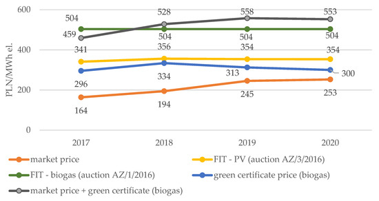 Electricity prices on the wholesale market and FIT for biogas and PV electricity in Poland [PLN/MWh]. Note: our elaboration based on data from [23]. 1 euro = ca. 4.7 PLN.