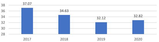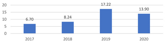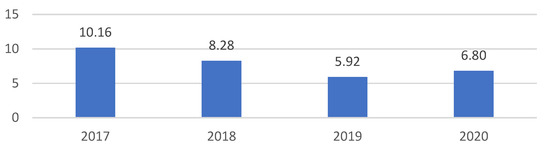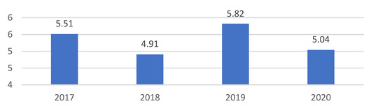 The DuPont analysis guides the equity owners, as well as the managerial team of a company, to find out the composition of ROE, which is contributed by three distinct variables (NPM, TAT, EQM). Figure 5 shows the value of the median ROE for the researched biogas plants for 2017–2020. The presented data show that the value of ROE improved significantly in the analyzed period. In 2019 and 2020, it was much larger than in 2017 and 2018. Compared to the energy sector in Poland, the value of ROE indicators in biogas plants should be considered as satisfactory [69]. Similarly, in Iotti and Bonazzi [61], it was discovered that ROE for biogas plants in Italy was characterized by high values, significantly higher than the average yield on Italian government bonds. Similarly, in Poland, ROE indicators for 2017–2020 were much higher than the average yield on Polish government bonds (approximately 0.5–2.0%). The downward trend in the value of the NPM index is disturbing (Figure 6), and this index increased in 2020. The lower the NPM ratio, the greater the value of sales must be accomplished in order to achieve a certain amount of profit. In the analyzed period, the efficiency of using the possessed property also decreased (Figure 7). The EQM indicator in the analyzed period ranged from approximately 5.0 to 6.0, which indicates a high level of indebtedness of the researched biogas plants (Figure 8). This situation may be disturbing in terms of maintaining financial liquidity, but it also confirms the relevance of financial debt in biogas plant firms’ capital management. A similarly high level of indebtedness of agricultural biogas plants was found in Italy [61]. This may indicate the fact that the development of biogas plants requires instruments of state intervention to facilitate access to bank loans or preferential lending for investments in this sector. This also indicates the need to conduct research on the assessment of the financial situation of biogas plants and their debt service capacity.
