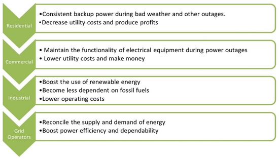 A chemical ESS has high storage capability but low energy density. Their cost is usually high, and the losses are even greater. More maintenance is required for such systems [69,70]. Electrical ESSs provides high power density and better power quality. They show a better response during peak hours, but their self-discharge rate is very high [63,71]. Hybrid ESSs area reliable and stable solution to these problems as they have high energy density as well as high power density due to the presence of both BESSs and supercapacitors. Their energy storage capability is also high. The drawback is that their control is comparatively complex [72,73,74]. Figure 2 summarises the main applications of ESSs from small-scale systems to large-scale systems.