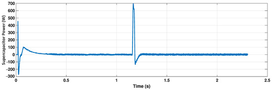 Variation in supercapacitor power with time for a step reduction in the PV output power from 900 W to 400 W at t = 1.2 s.
