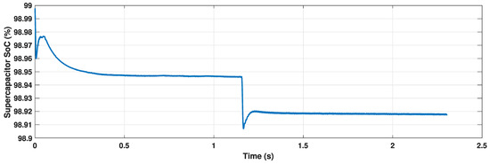 Variation in supercapacitor SoC with time for a step reduction in the PV output power from 900 W to 400 W at t = 1.2 s.