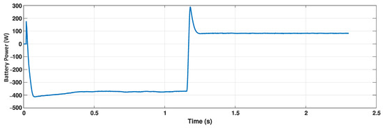 Variation in battery power with time for a step reduction in the PV output power from 900 W to 400 W at t = 1.2 s.