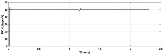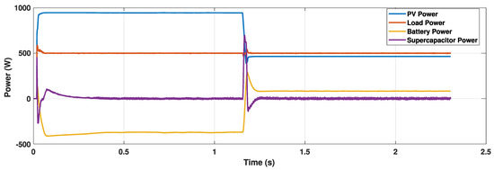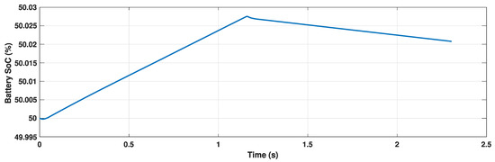 Figure 7 shows the battery charging and discharging power characteristics for the considered case study. It can be observed that the battery is charging initially until the time that the PV power is more than the load power. However, at 1.2s, the battery starts discharging itself to support the load by providing the deficit amount of power to the load. Variations in battery SoC can be observed in Figure 8. Since the battery is initially charged by the excess amount of power generated by the PV, the battery SoC can be seen to increase, while, after 1.2s, the battery starts being discharged, so the battery SoC also decreases. The DC-link voltage variation is shown in Figure 9. It can be observed from the figure that the DC-link voltage is maintained as constant throughout due to the action of the HESS. Fluctuations in the DC-link voltage can be observed at 1.2s. Due to the action of the HESS, the deviation is mitigated, and the voltage is maintained at the same constant value. Figure 10 shows the variation in battery power and the supercapacitor power with the variation in PV power. It can be observed that a constant load power of 500W is required throughout. Initially, the generated power is sufficient to serve the load; hence, the SC and BESS do not need to discharge. The BESS takes the excess amount of power by charging itself while the supercapacitor acts only during transients. A drop in the generated power can be observed at 1.2s. Now, during this transient condition, the supercapacitor consumes the power to maintain the DC-link voltage. After 1.2s, the generated power is less than that required by the load. The battery comes into action to compensate for the rest of the required power by discharging itself. The DC-link voltage is maintained by the prompt action of the HESS.