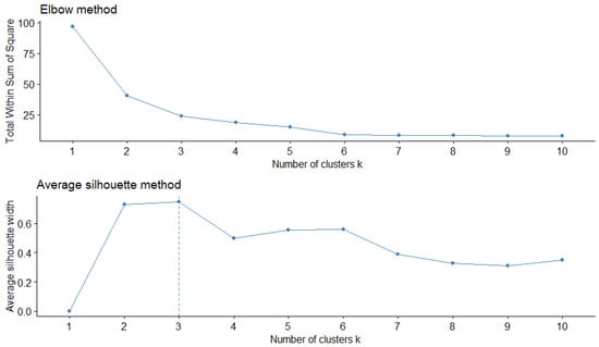 Instead of a single method, a sequence of methods have been employed to investigate the literature-identified [,,] research gap and achieve the paper’s primary objective. The first method was the SLR variation based on the Scopus database queries [,]. The second method was a tabular comparison of the calculated results presented in detail in Supplementary File S1. The third method was the K-Means Clustering Algorithm, which is an unsupervised machine learning to explore secondary data from the Passport business database [] in the R programming environment.